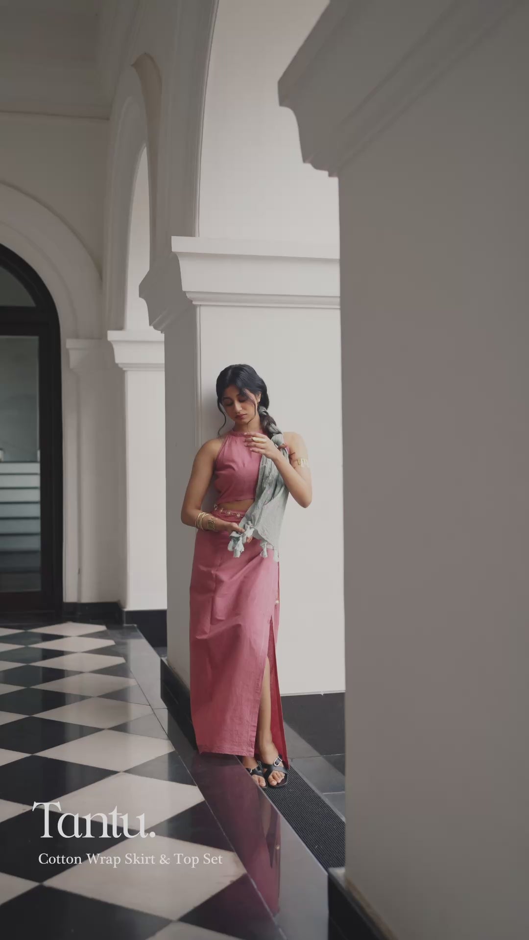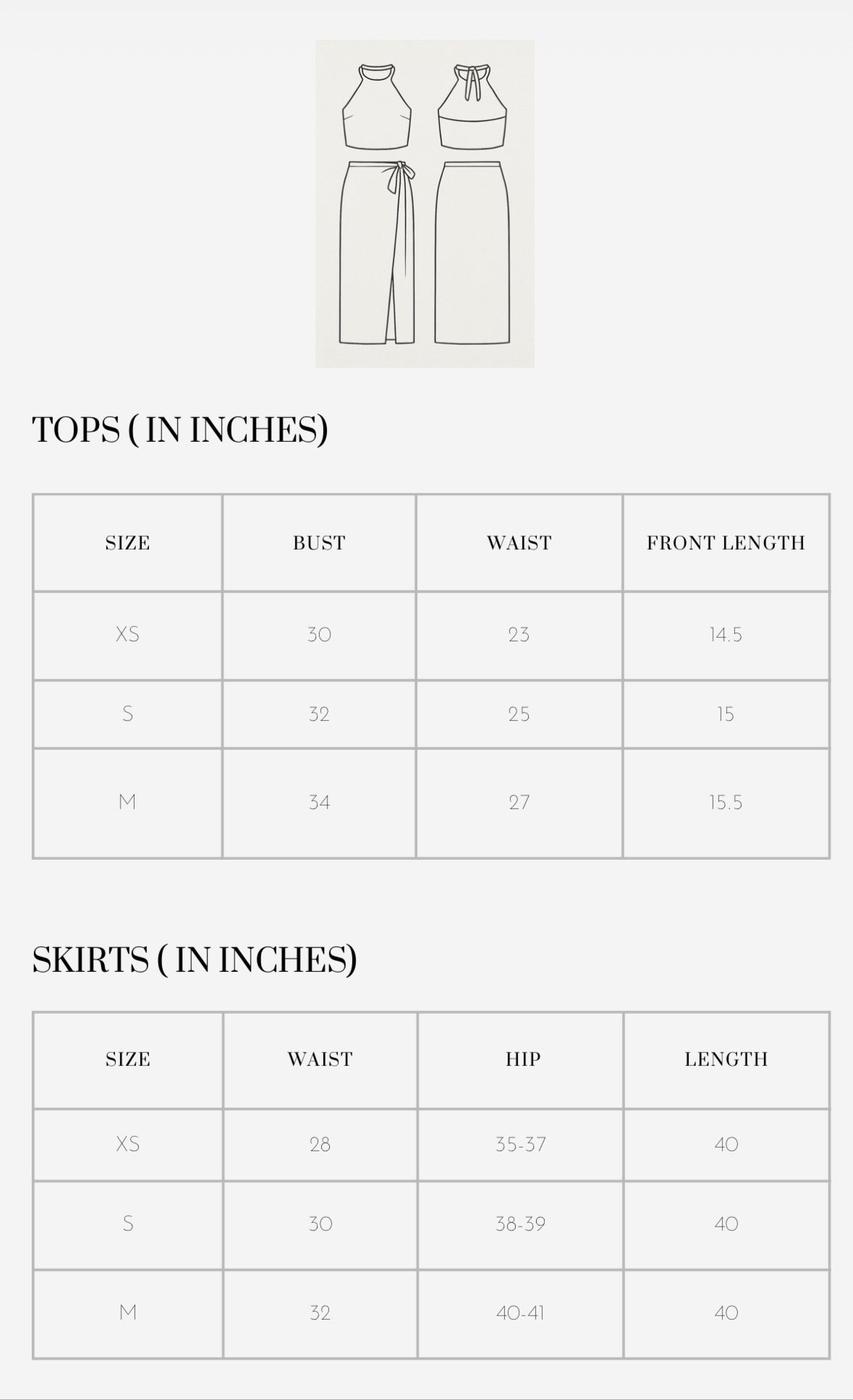 The halter crop top pairs with a wrap skirt featuring a front slit.