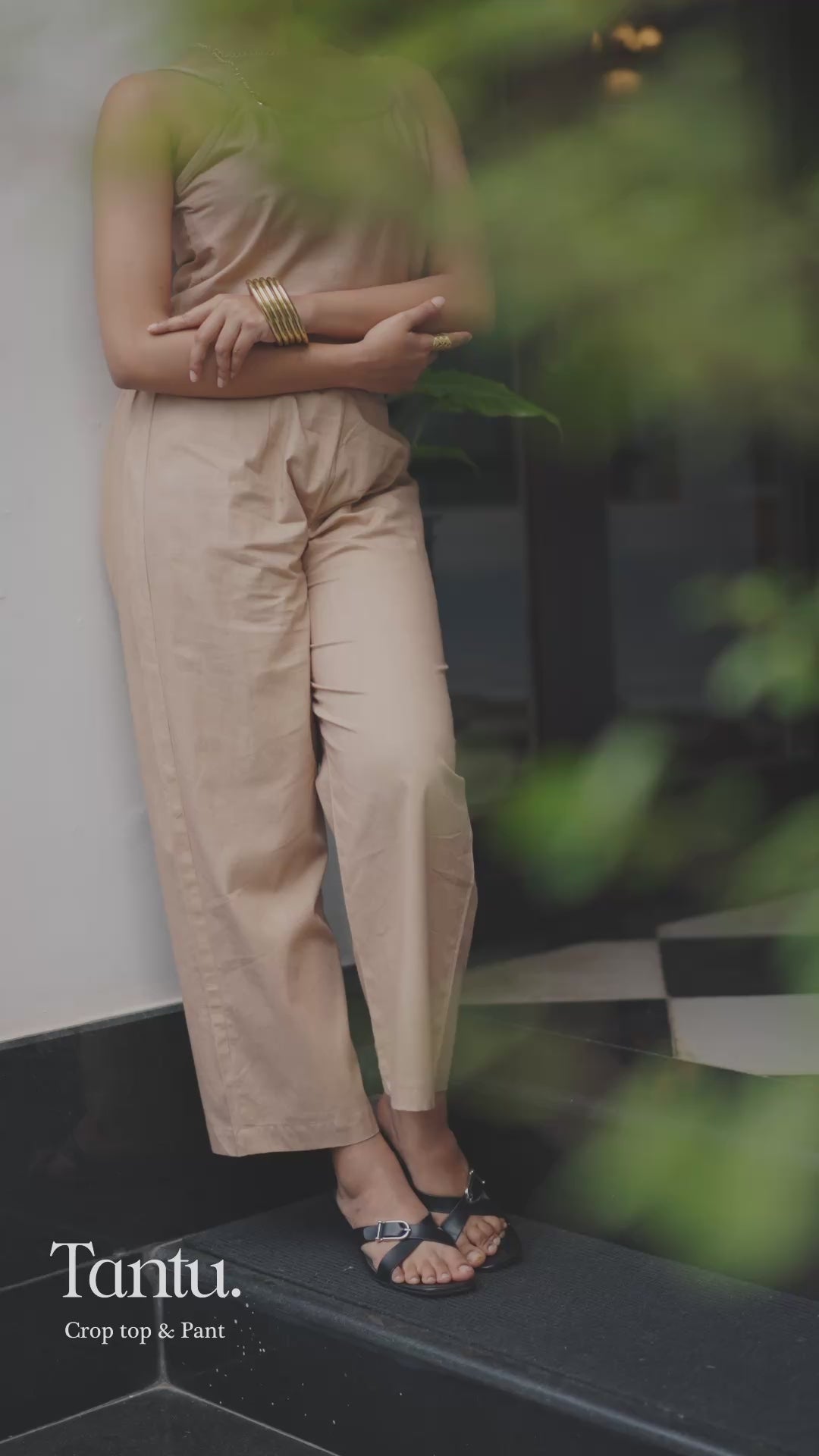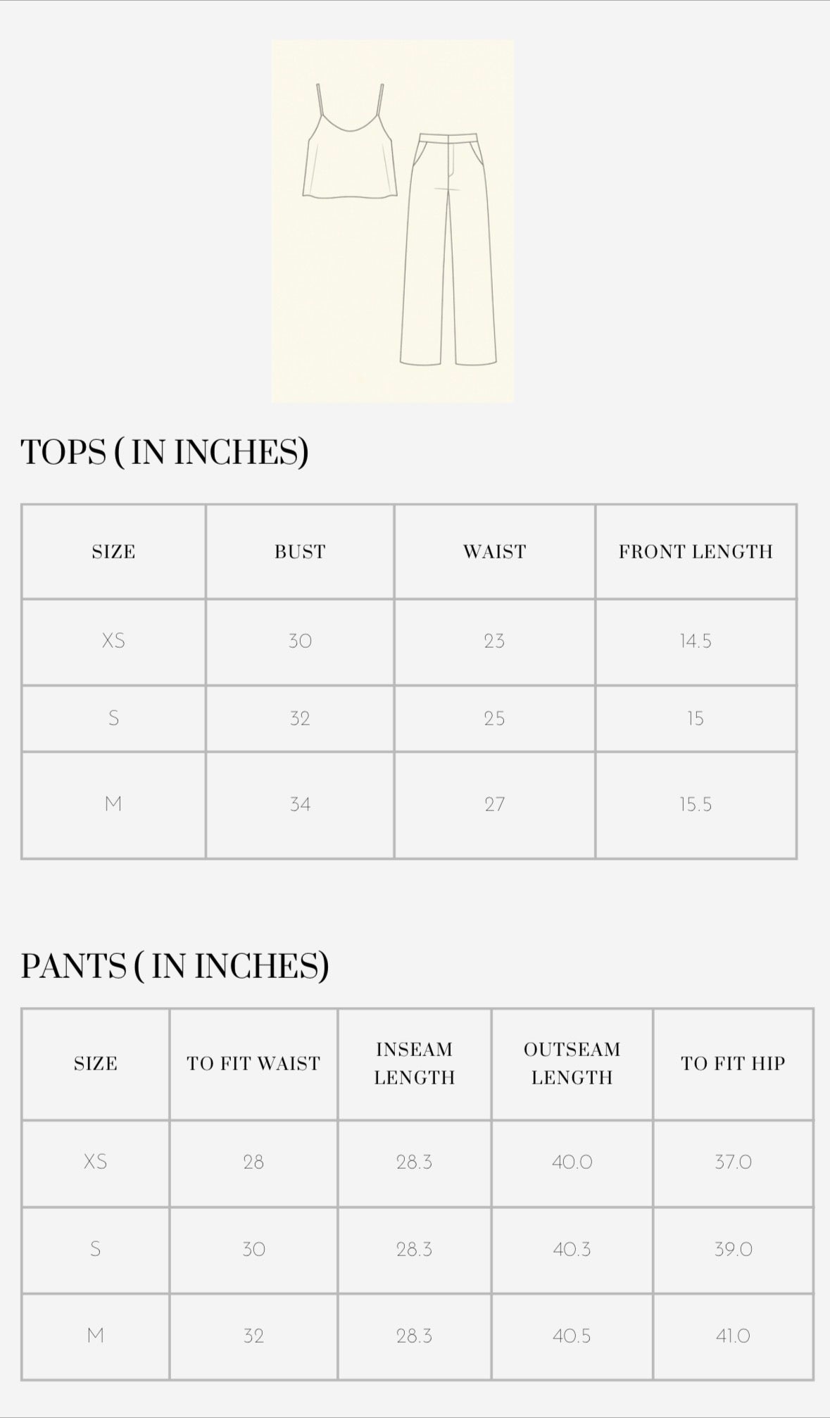 • Clean camisole crop with slim straps; relaxed straight‑wide leg pant.
